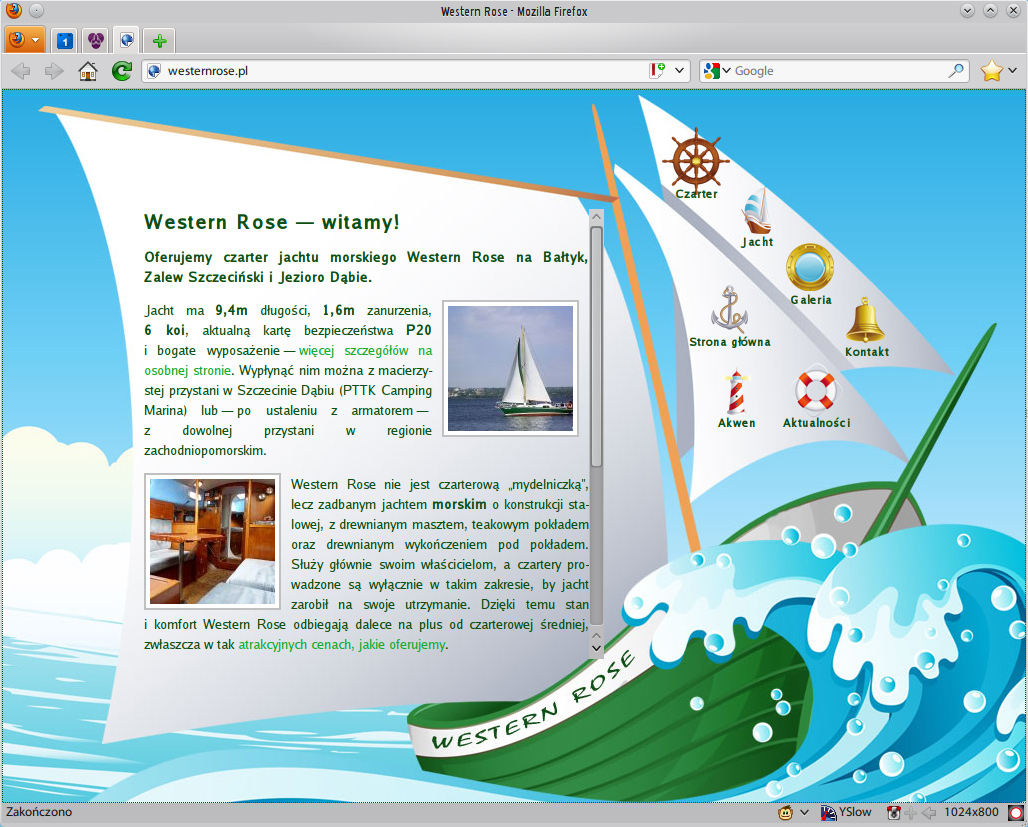 Znacznie mniej formalna od większości naszych kreacji, jednak nadal integrująca dane z różnych źródeł - w tym przypadku kalendarz czarterów pochodzi z Google Calendar.